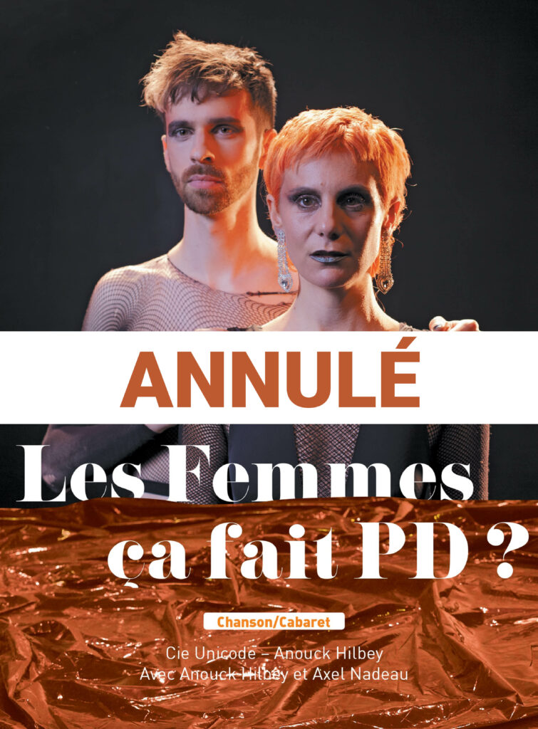 « Les femmes ça fait PD […], les femmes, ça met des jupes. Non mais de quoi j’m’occupe ? Les femmes, ça met des bas. Nylon ou soie. » les mots de Gainsbourg résonnent dans la voix de la chanteuse Régine… Presque 45 ans après, Anouck Hilbey fait de cette chanson intemporelle le titre de son spectacle comme un étendard provocateur qui plante le décor d’entrée de jeu. Avec beaucoup d’humour, une touche d’insolence mais surtout une grande lucidité, Les femmes ça fait PD ? détourne les chansons cultes du répertoire populaire. Entre tour de chant, cabaret et stand-up, l’ex-créature de l’illustre cabaret parisien Madame Arthur, accompagnée du musicien Axel Nadeau, met en lumière les œuvres ayant été sources d’inspiration et de (dé)construction identitaire pour de nombreuses générations. Dans cette forme piano-voix où chaque mot est aiguisé, les femmes et les minorités de notre société sortent de l’ombre et sont placées sur le devant de la scène. De Ariane Moffatt à Camélia Jordana en passant par Niagara, Damso, Clarika, Eddy de Pretto et Francis Cabrel, les chansons d’hier et d’aujourd’hui prennent une autre ampleur.