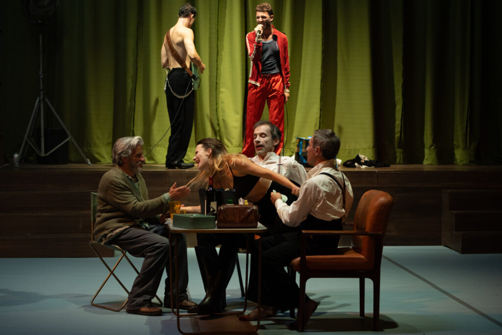 Entrez dans les tribulations d’une famille de comédiens en tournée dans le centre de l’Europe ! La représentation vient de se terminer et la troupe regagne les loges, ou plutôt ce qui leur tient lieu de loge. Peut-être l’arrière-salle d’une salle des fêtes où l’on aurait installé des tables de maquillage avec miroirs, des paravents ainsi que quelques matelas ou lits de camp. Il pourrait y avoir également des portants avec des éléments de costumes de scène, des valises, un réchaud à gaz… La représentation n’a pas été brillante et le public peu enthousiaste. Ils sont fatigués, épuisés et déçus de la vie qu’ils mènent. Mais ce soir, ils fêtent un événement important, cette soirée est particulière. La fille aînée des patrons de la troupe se fiancera, dans les coulisses, avec le jeune premier de la fin de l’acte I. Elle l’épousera, ils seront chefs du théâtre, ils joueront le répertoire de la compagnie, contre tous les aléas de l’existence, les hôtels mal chauffés, le petit personnel agressif des salles des fêtes de province et l’indifférence narquoise du public et des enfants imbéciles. Demain, nous fuirons, mais ce soir encore, nous faisons semblant puisque nous ne savons rien faire d’autre.